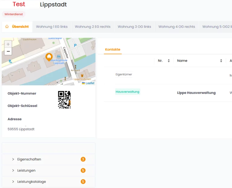 Objekte werden mit allen nötigen Ansprechpartnern, Anlagenplänen, Wartungsprotokollen, Leistungsverzeichnissen etc. hinterlegt.