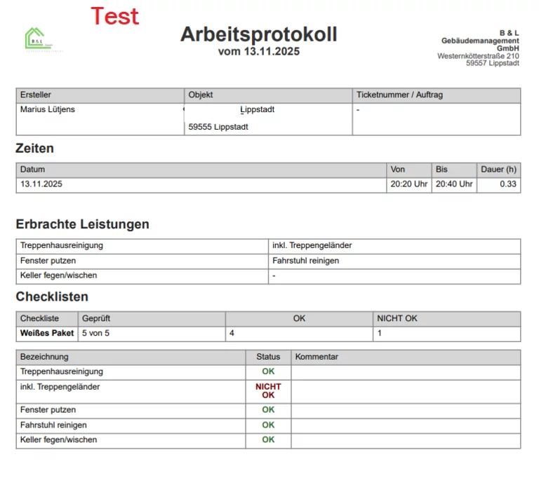 Für alle Aufgaben, egal ob einmalig oder Wiederkehrend erstellen unsere Mitarbeiter Arbeitsprotokolle. Ob und wann die Arbeiten erledigt wurden kann so nachvollzogen werden und sollte eine Aufgabe mal nicht erledigt werden können sehen wir auch später noch womit dies zusammen gehangen hat.